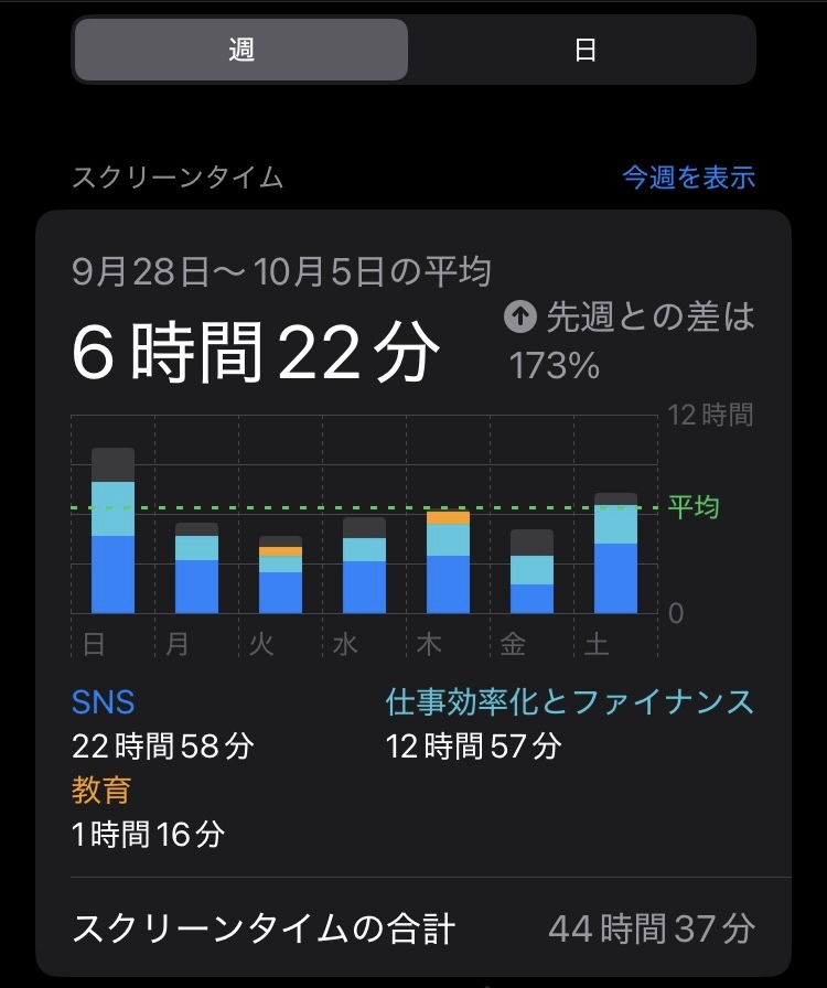 また、SNSの時間が22時間58分 → 8時間51分へ。一週間で14時間削減できたことになります。