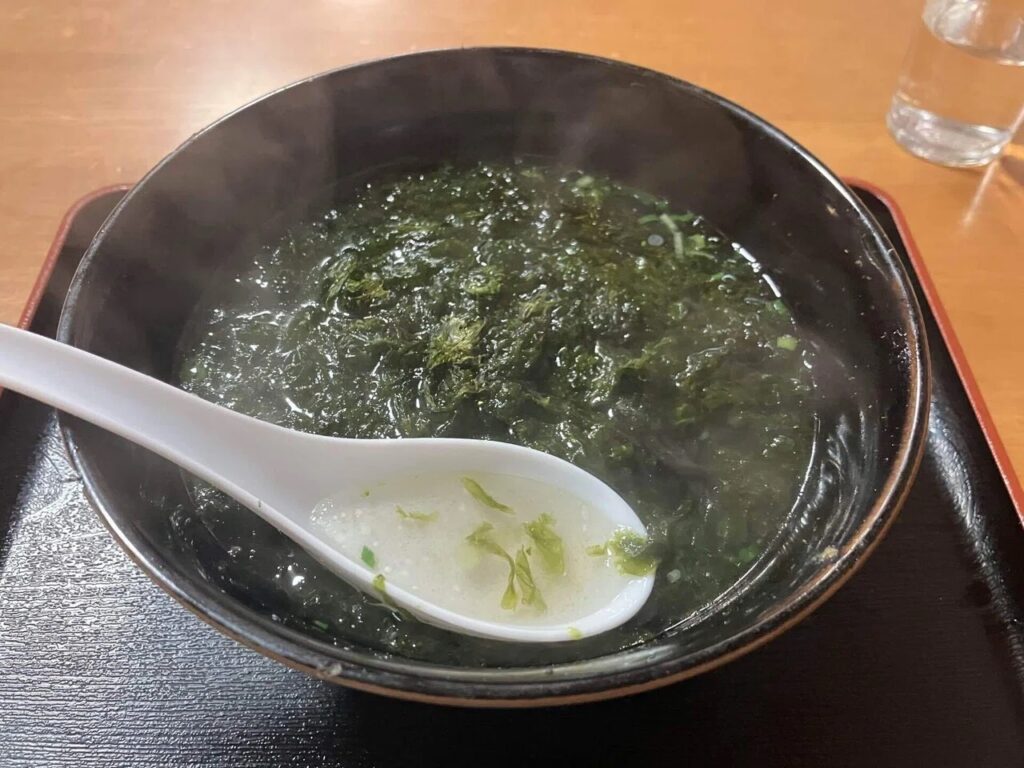 地海苔ラーメン。海苔の中から黒い麺が表れてインパクト大!あっさり塩味で美味。